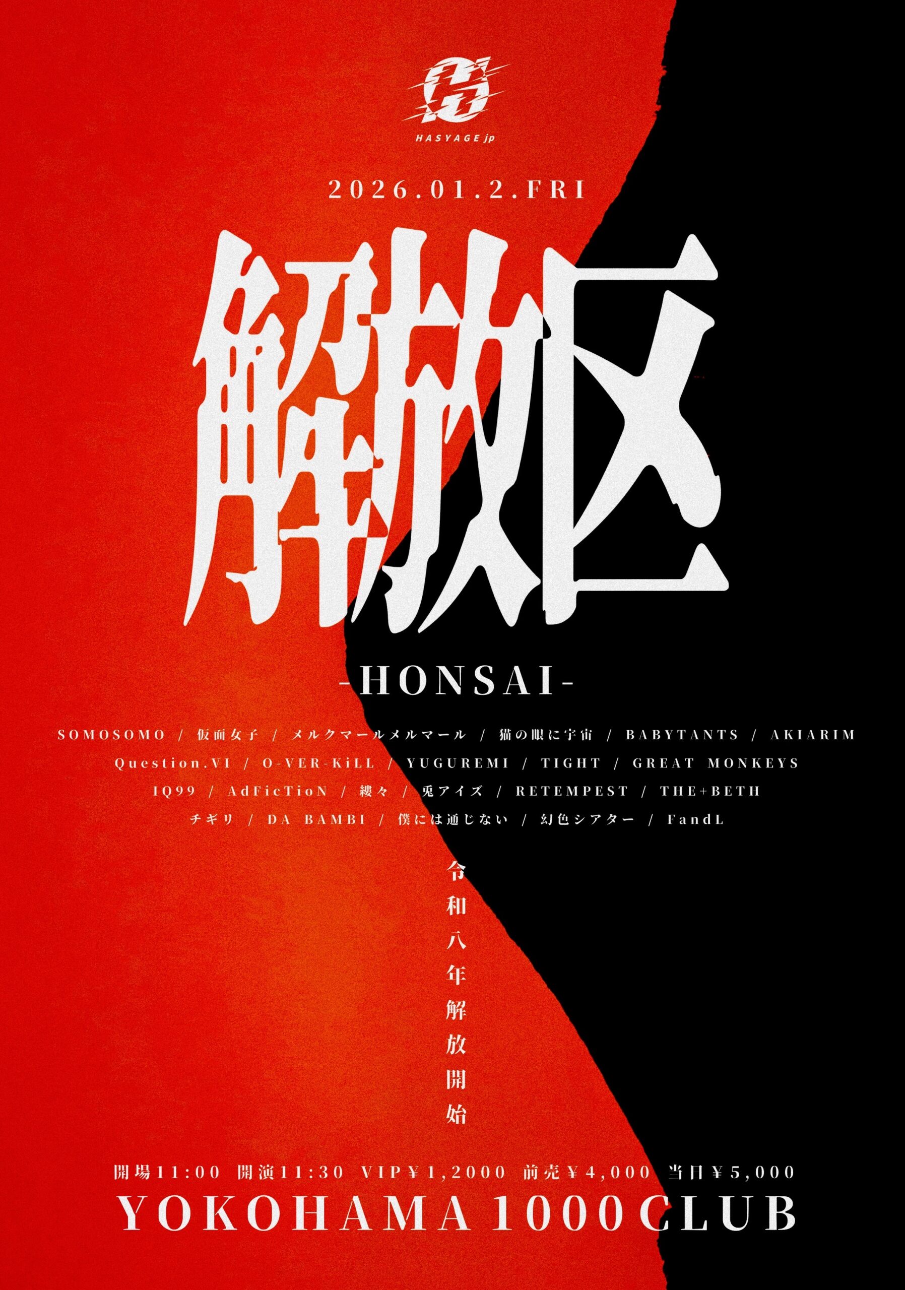 VIP:¥12,000 (VIPパスチケット / 後方椅子席(休憩エリア) / 全グループ名入り解放区Tシャツ) / 前売:¥4,000 / 当日:¥5,000